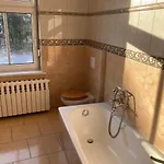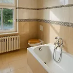 Da questo luogo potrai godere di una vista sul giardino. La villa Naturidylle Mit Kamin Und Sauna In Der Schorfheide dispone di un bagno con una vasca da bagno e un bagno alla francese. Sono inoltre disponibili asciugacapelli e asciugamani.